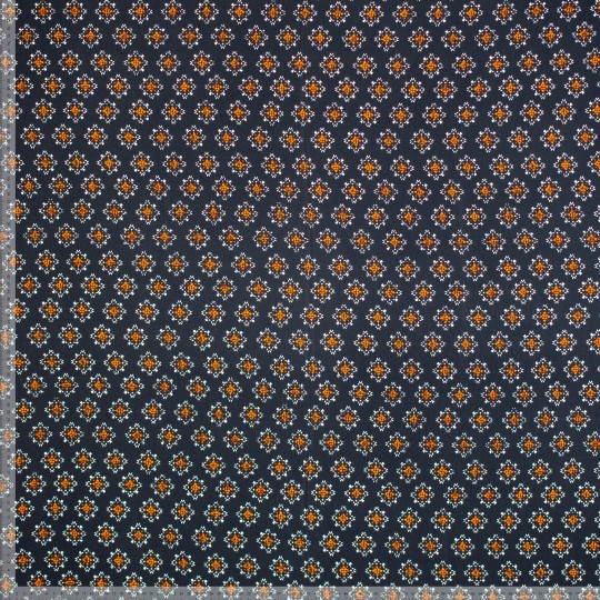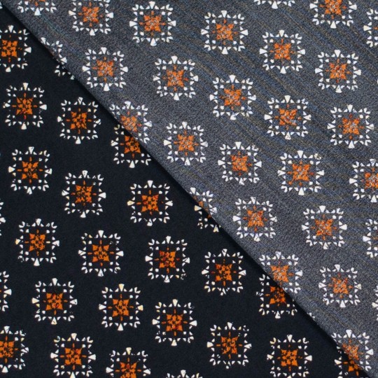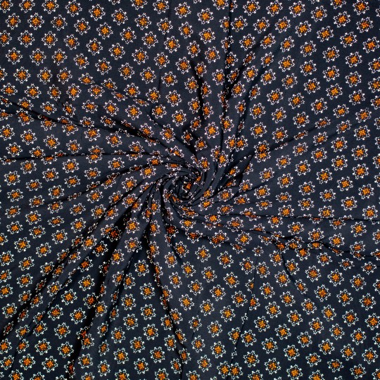 Een geweven crêpestof van 100% viscose met een bedrukking van oranje sterretjes.