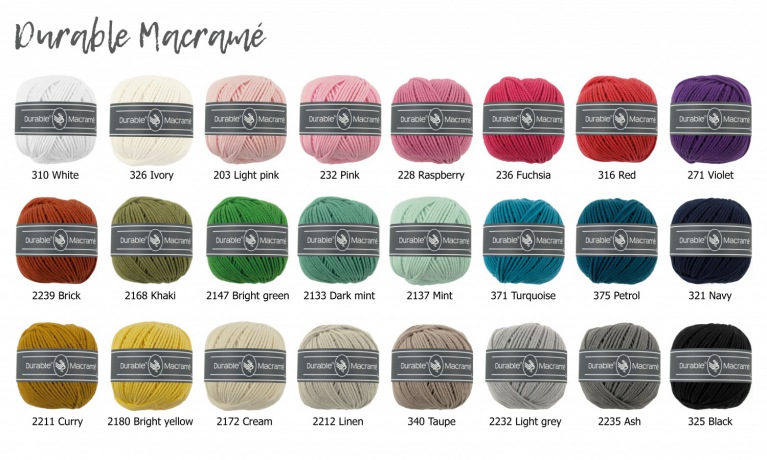 Durable Macramé is gemaakt van 100% robuust en stoer katoen waardoor het bijzonder geschikt is voor de macramé knooptechniek. Je kunt er mooie wandhangers, plantenhangers, stoere kussens en nog veel meer van maken. Met de vele prachtige kleuren kun je volop variëren en je macramé projecten naar eigen smaak maken. Het garen leent zich ook uitstekend voor allerlei haak- en breiprojecten. Machine wasbaar op 60 graden fijn was.