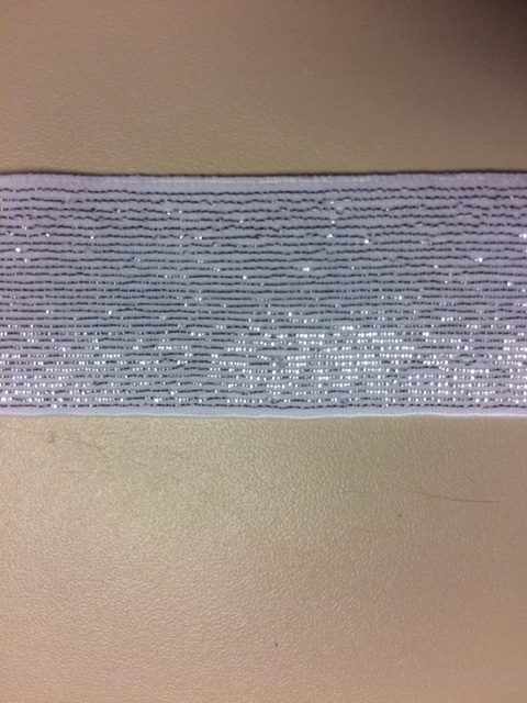 Wit elastisch band van 25 mm.breed met zilvermetallic glans. Omdat het zilver door het band heen geweven is verschilt de zilverglans door de lichtinval.