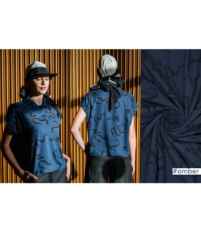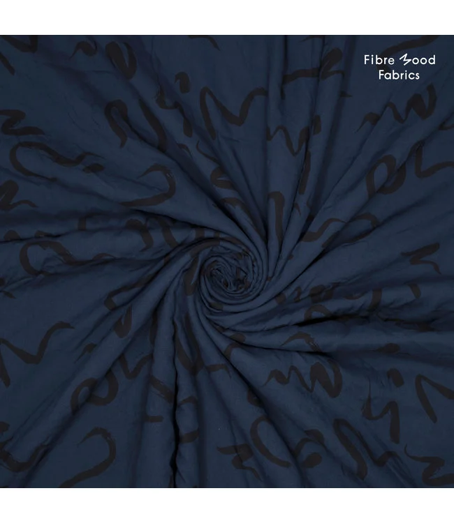 Deze blauwe Ecovero viscose met print wordt gebruikt voor Fibre Mood model Amber en is duurzaam gemaakt volgens de OEKO-TEX Standard 100.