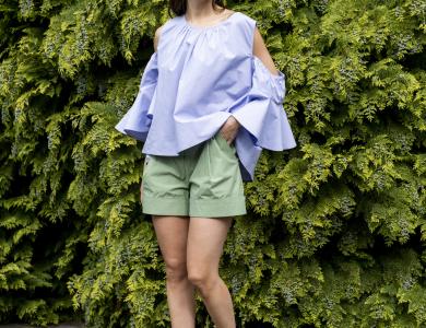 Deze geweven combed katoenen stof met wordt verwerkt in Fibre Mood nummer 24 / patronen Augusta / Dahlia / Nikka / Sunny