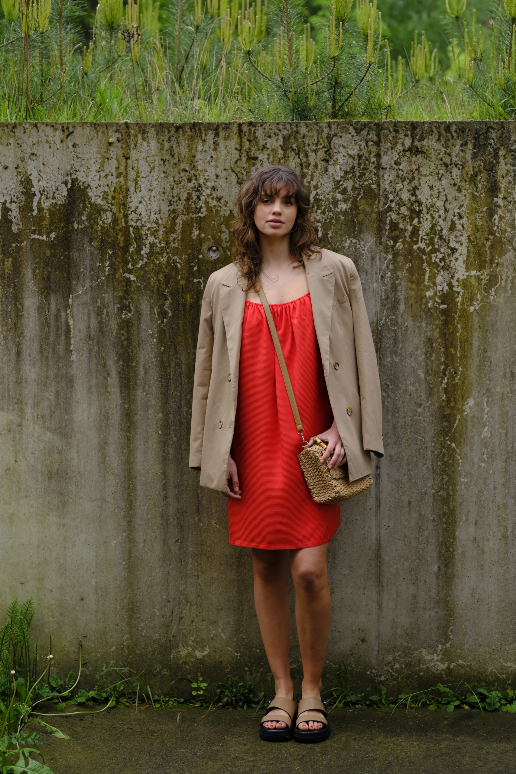 Deze 100% viscose met shiny stripes wordt gebruikt voor Fibre Mood model Elvira en is duurzaam gemaakt volgens de OEKO-TEX Standard 100.