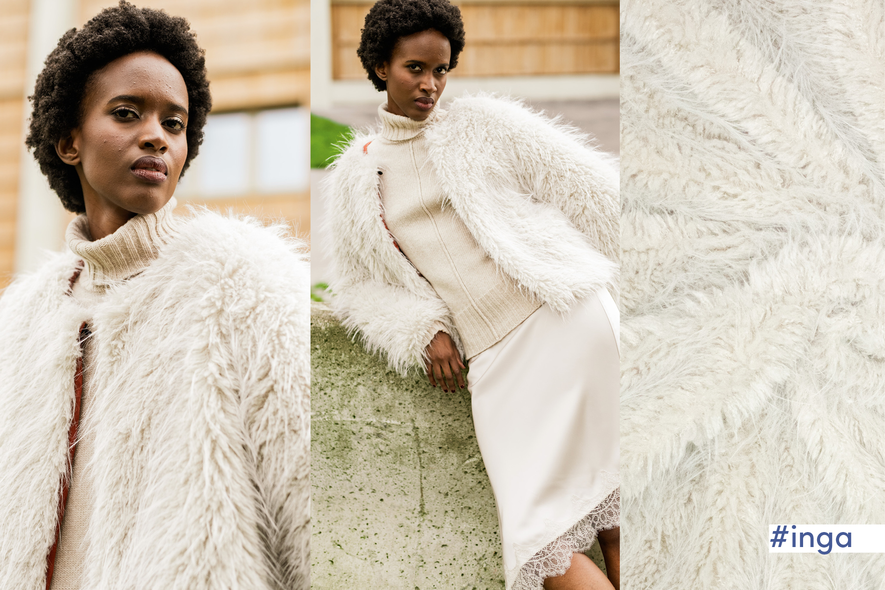 Deze harige imitatiebont wordt gebruikt voor Fibre Mood model Inga en is duurzaam gemaakt volgens de OEKO-TEX Standard 100.