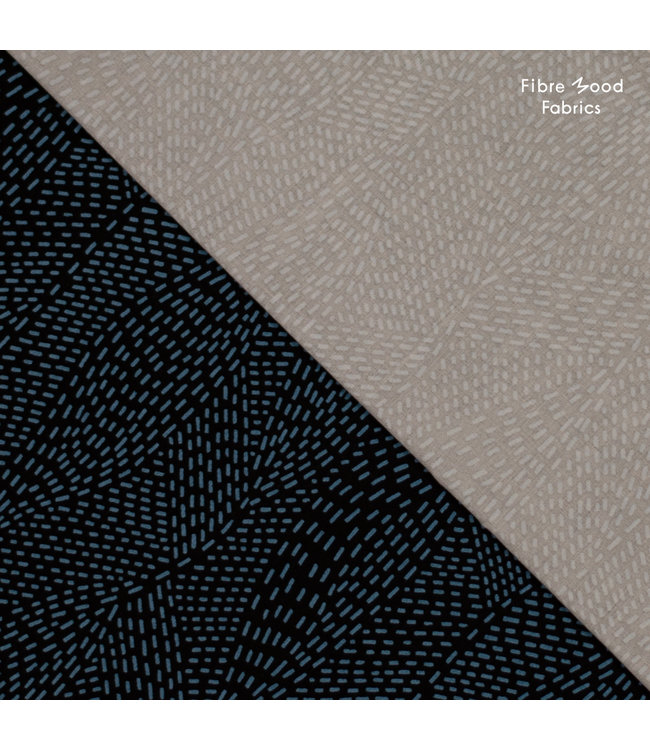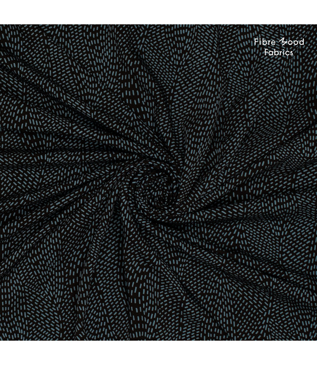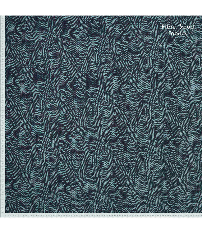 Deze viscose tencel stof met blauw-zwarte print wordt gebruikt voor Fibre Mood model Kaya en is duurzaam gemaakt volgens de OEKO-TEX Standard 100