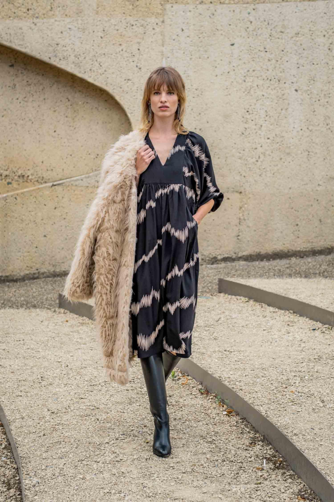 Deze viscose met tencel stof Kris Kras zwart wordt verwerkt in Fibre Mood nummer 21 / patroon Kika