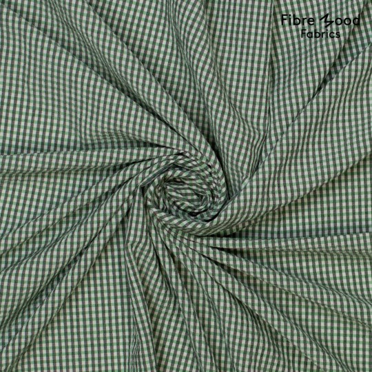 Deze mooie stof heeft een grijs/groen/witte ruit en een kreukeleffect zoals een seersucker en wordt gebruikt voor Fibre Mood model Lulu en is duurzaam gemaakt volgens de OEKO-TEX Standard 100.