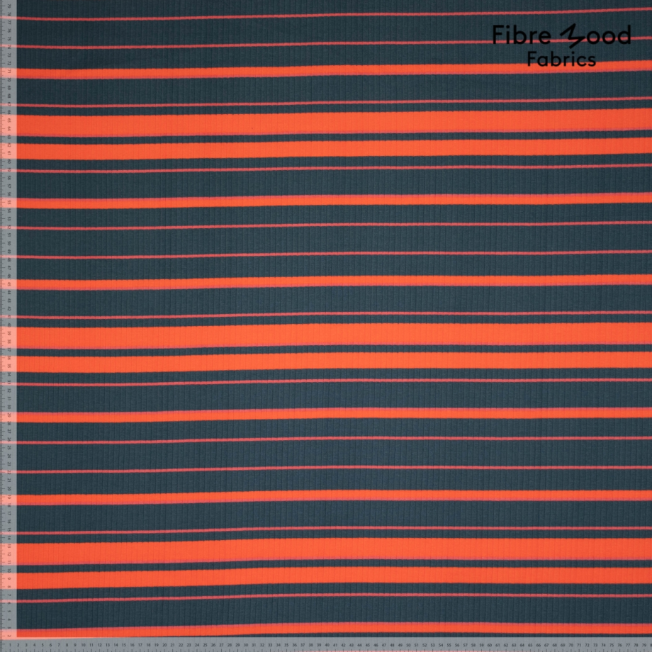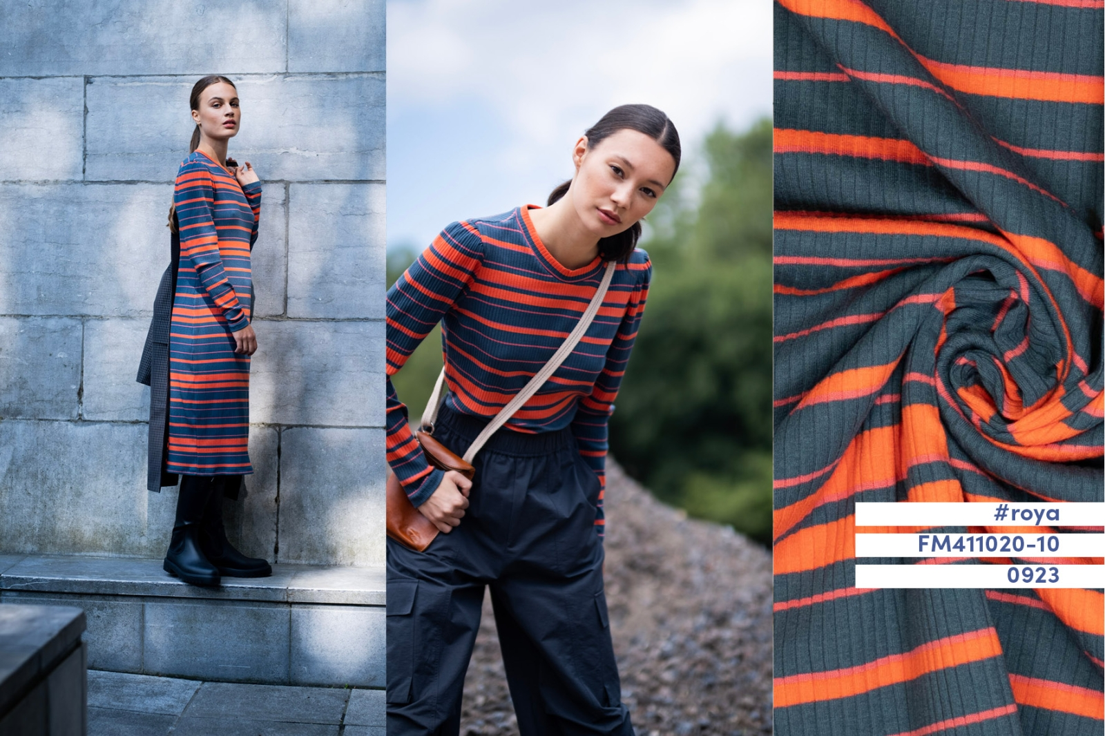 Deze jersey stof met groen en oranje strepen wordt gebruikt voor Fibre Mood model Roya en is duurzaam gemaakt volgens de OEKO-TEX Standard 100