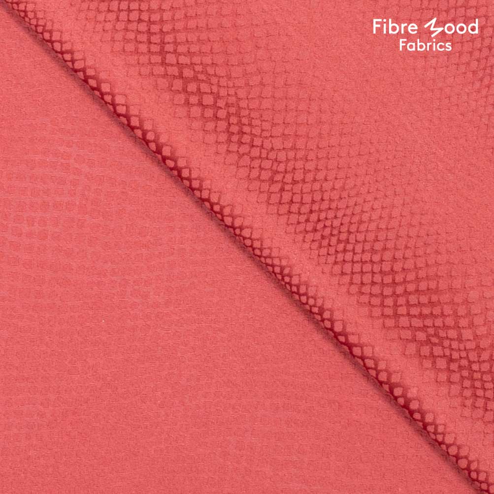 Deze rode geweven jacquardstof met dierenprint wordt gebruikt voor Fibre Mood model Zinnia en is duurzaam gemaakt volgens de OEKO-TEX Standard 100.