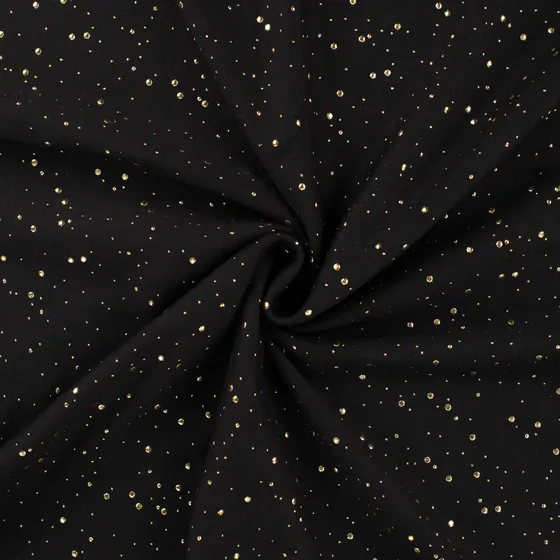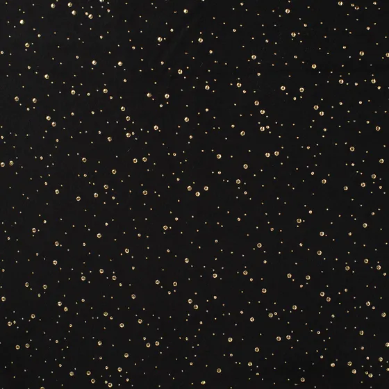 Deze French Terry stof met gouden glitter universe in de kleuren zwart kun je onder andere gebruiken voor het maken van kleding, babykleding, jurken, sweaters en meer…