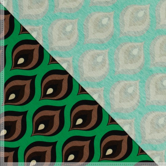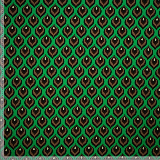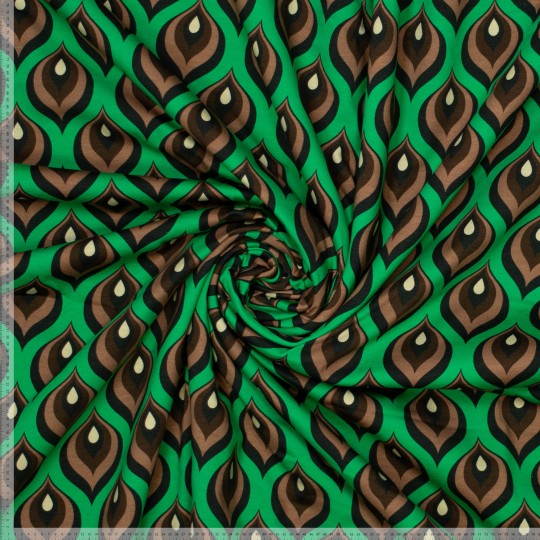 Deze gebreide stof met retro print met vlam is duurzaam gemaakt volgens OEKO-tex standaard 100 en bestaat uit 95% katoen en 5% elasthan. Deze rekbare stof is 150 cm breed en 200 gr/m2 en beschikbaar in meerdere kleuren. Deze stof kan onder andere gebruikt worden voor kleding, babykleding, jurken, rokken, en meer..