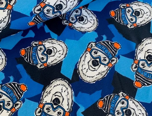 Deze joggingstof met ski beer print kan onder andere gebruikt worden voor kleding, truien, vesten en meer..