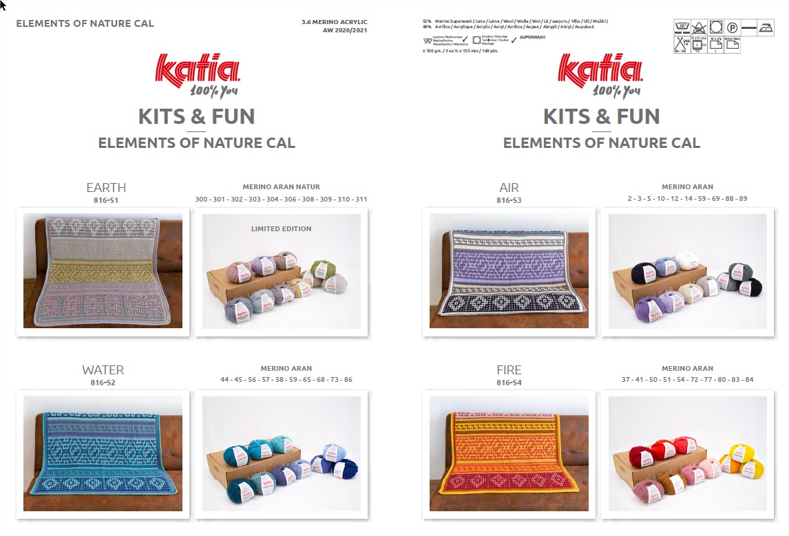 De nieuwe Katia Cal Elements of nature gaat half september van start. In het pakket vindt je 10 bollen Merino Aran in 10 verschillende kleuren. De deken is door @bykatherinacrochet ontworpen. Haak hem met de mozaiek techniek in een van de 4 kleurencombinaties, geïnspireerd op de natuurelementen: Air (lucht), Water (water), Fire (vuur) en Earth (aarde).
