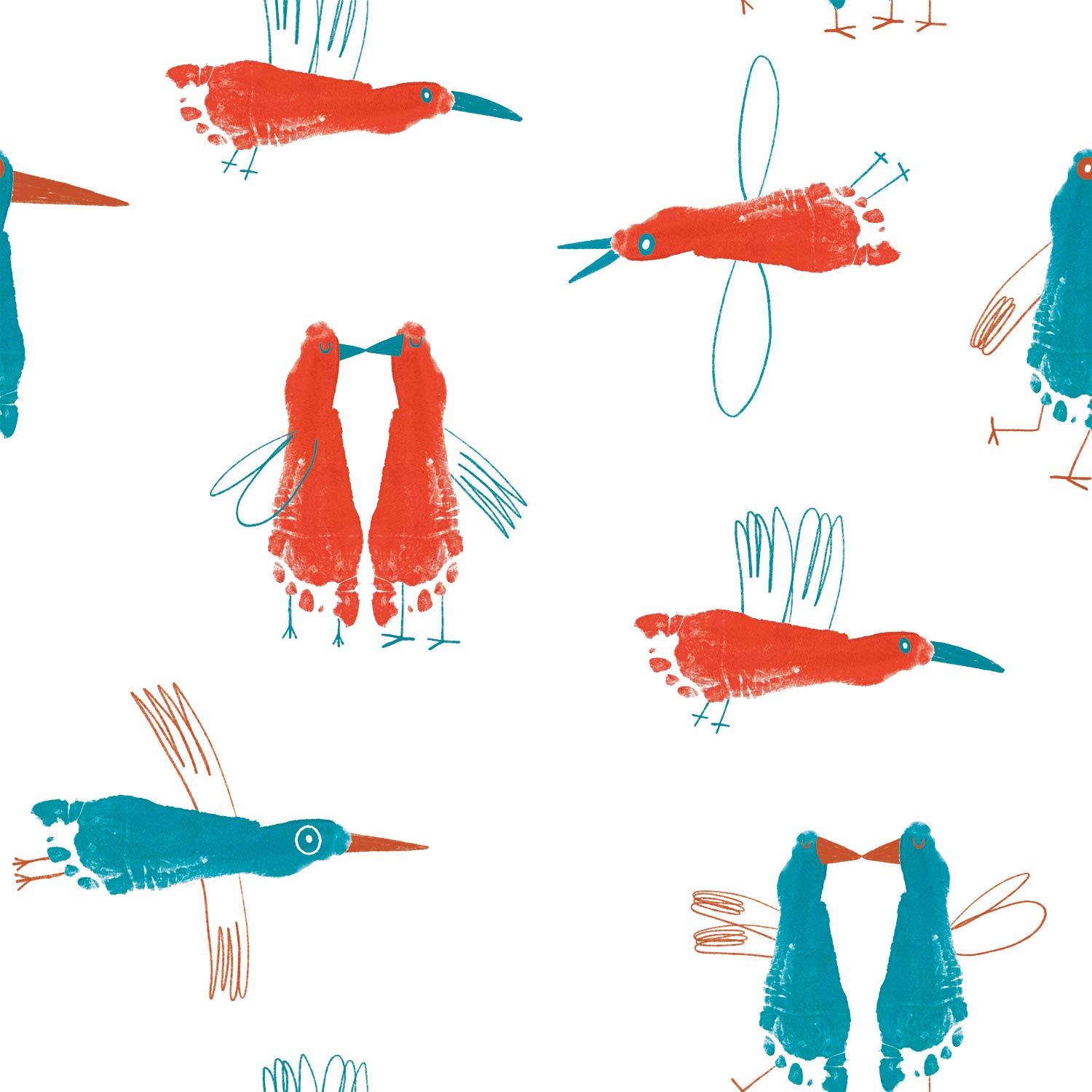 French Terry stof met een verfspoor van kindervoeten met fantasie omgetoverd in vliegende diersoorten in opvallende kleuren. Ideaal voor kledingstukken als sweaters, broeken of jasjes.