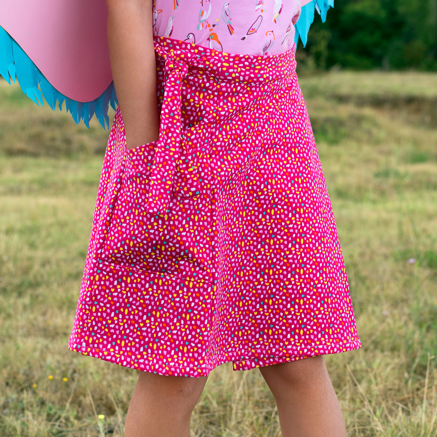 French Terry stof met hardroze ondergrond en kleurige toetsen in roze, geel, oranje en violet. Ideaal voor kledingstukken als sweaters, jurken of cardigans.