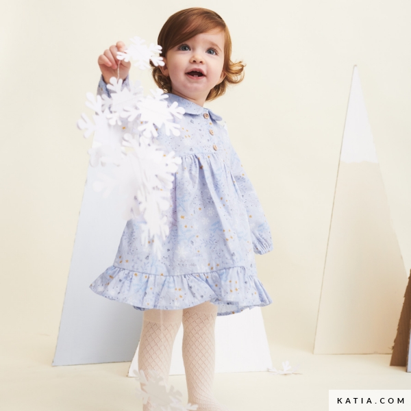 100% katoenen stof met een print van bloemen, takken en sneeuwvlokken op een lichtblauwe achtergrond. De katoenen stof Poplin Artic Flowers van Katia Fabrics is een hele zachte stof van uitstekende kwaliteit. Het is ideaal om comfortabele en mooie kleding voor jouw kleintje te naaien, zoals blouses en jurken.