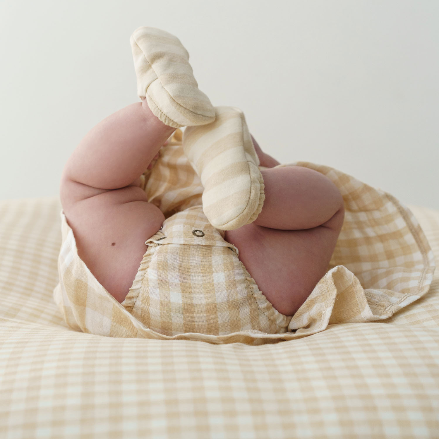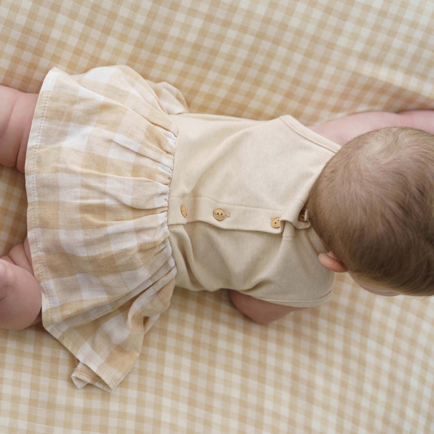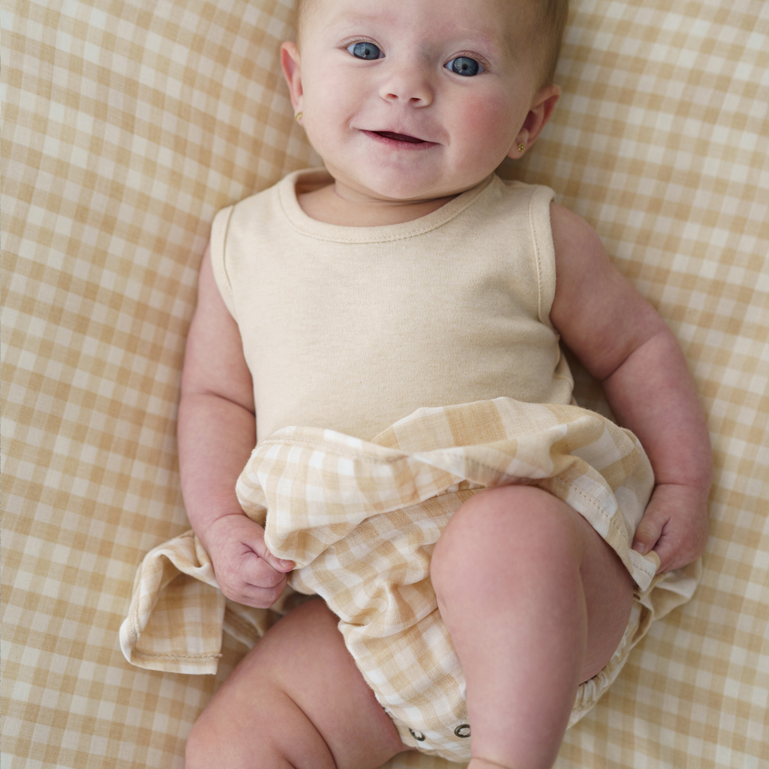 Dubbellaagse 100% biologische katoenen mousseline stof met een grote Vichy-ruitprint in een combinatie van de kleuren écru en lichtbruin. Deze zeer zachte stof is biologisch afbreekbaar, chemicaliënvrij en hypoallergeen. Een tijdloze stof die perfect is voor babyshowers, geboortefeestjes en voor de eerste babykleding. Naai met de puurste katoenen mousseline omslagdoeken voor de baby , pyjama’s, shirts of rompertjes.