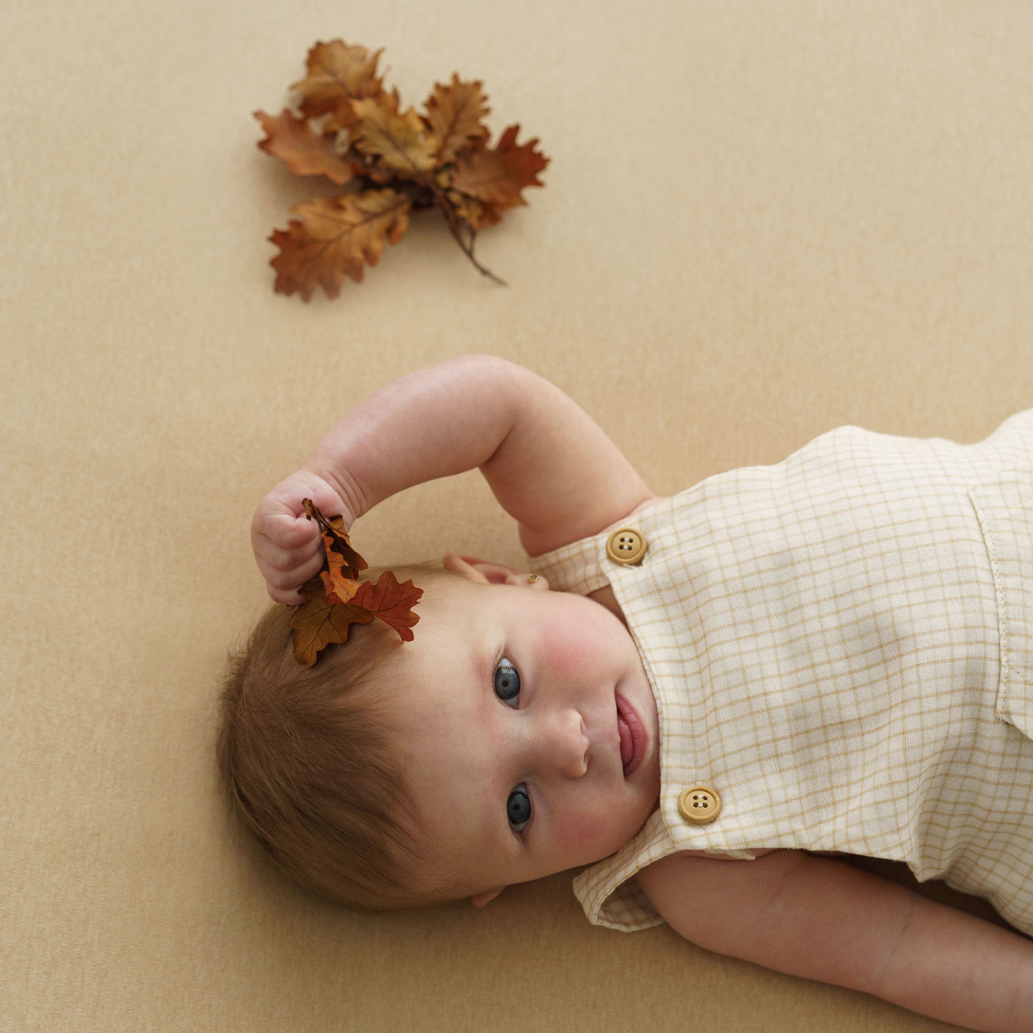 Dubbellaagse 100% biologische katoenen mousseline stof in de kleuren écru en bruin, waardoor een klein raster ontstaat.. Deze zeer zachte stof is biologisch afbreekbaar, chemicaliënvrij en hypoallergeen. Een tijdloze stof die perfect is voor babyshowers, geboortefeestjes en voor de eerste babykleding. Naai met de puurste katoenen mousseline omslagdoeken voor de baby , pyjama’s, shirts of rompertjes.