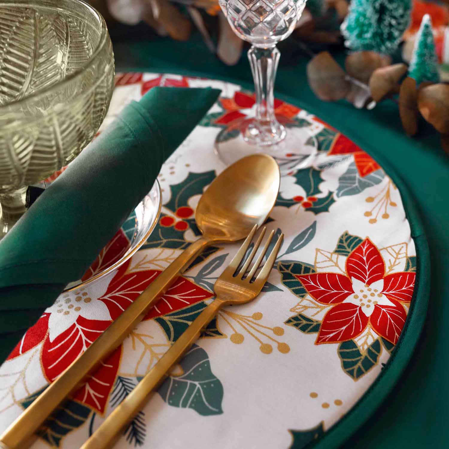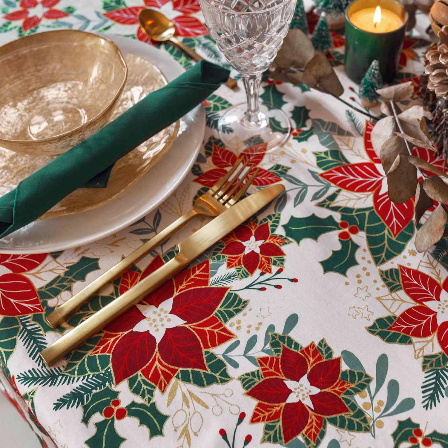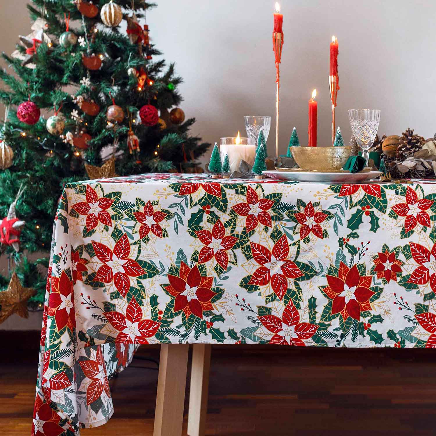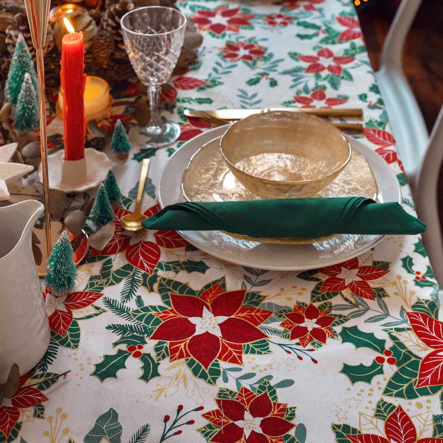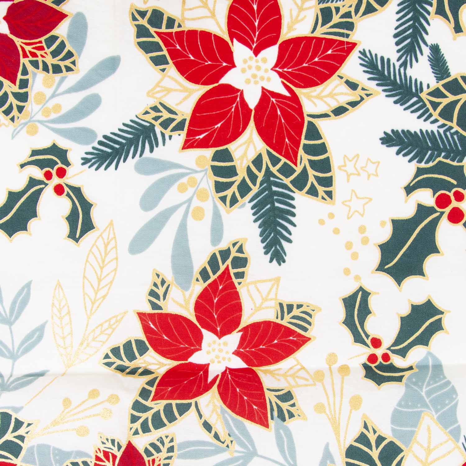 100 % katoenen stof met een originele kerstopdruk in rode, groene en goudkleurige kleurschakeringen op witte ondergrond. Met de Poplin Poinsettia Xmas stof van Katia Fabrics kun je tafelkleden, servethouders en alle soorten kerstversiering maken die je maar kunt bedenken.