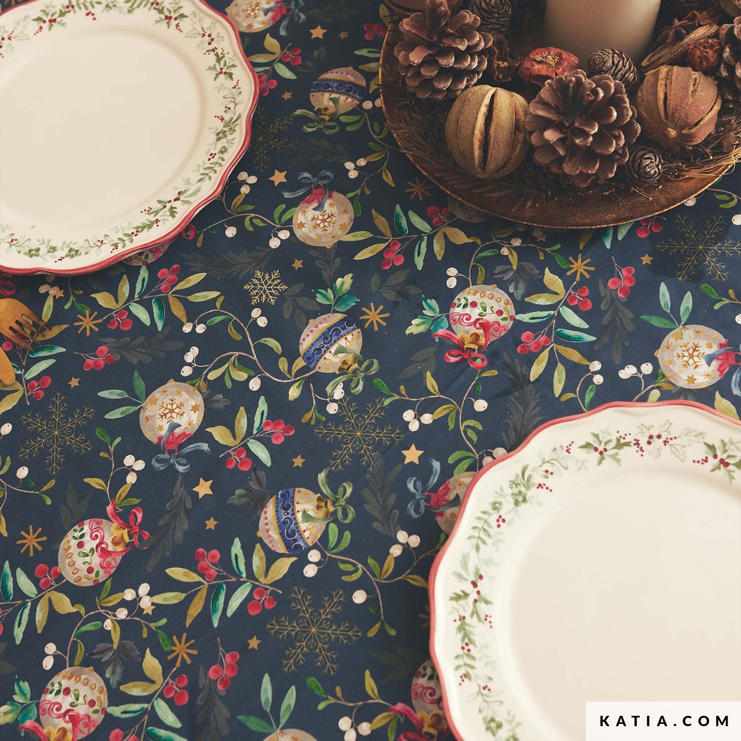 Katoenen popeline stof van 100% katoen met een print van kerstelementen en kerstballen in groen, rood en goud op een donkerblauwe achtergrond. De popeline stof Xmas Bells van Katia Fabrics is voorzien van het Standard 100 by Oeko-Tex® certificaat. Deze hoogwaardige popeline stof is fijn en zacht. Het is ideaal voor kussens, tafelkleden en servetten, evenals allerlei kerstdecoraties die je maar kunt bedenken.