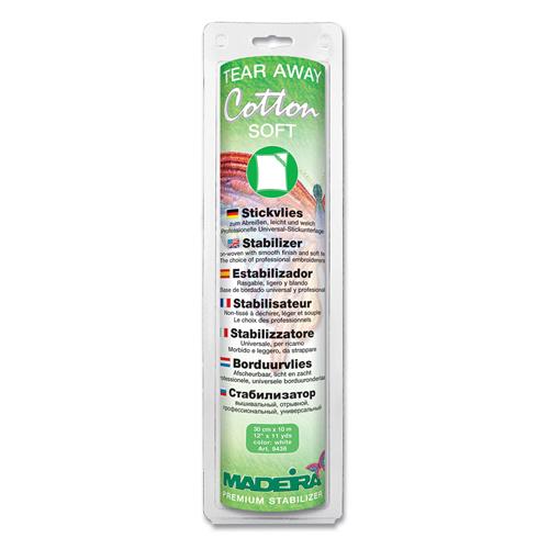 Madeira Cotton Soft is een scheurvlies gemaakt van 100% katoen. Cotton Soft is een lichte en professionele universele stabilisatie voor verscheidene stoffen. Het geeft elastische stoffen de nodige stabilisatie om de stof tijdens het stikken op zijn plek te houden en om knoopsgaten te naaien. Een verpakking bevat een 30cm brede Madeira Cotton Soft scheurvlies met een lengte van 10 meter