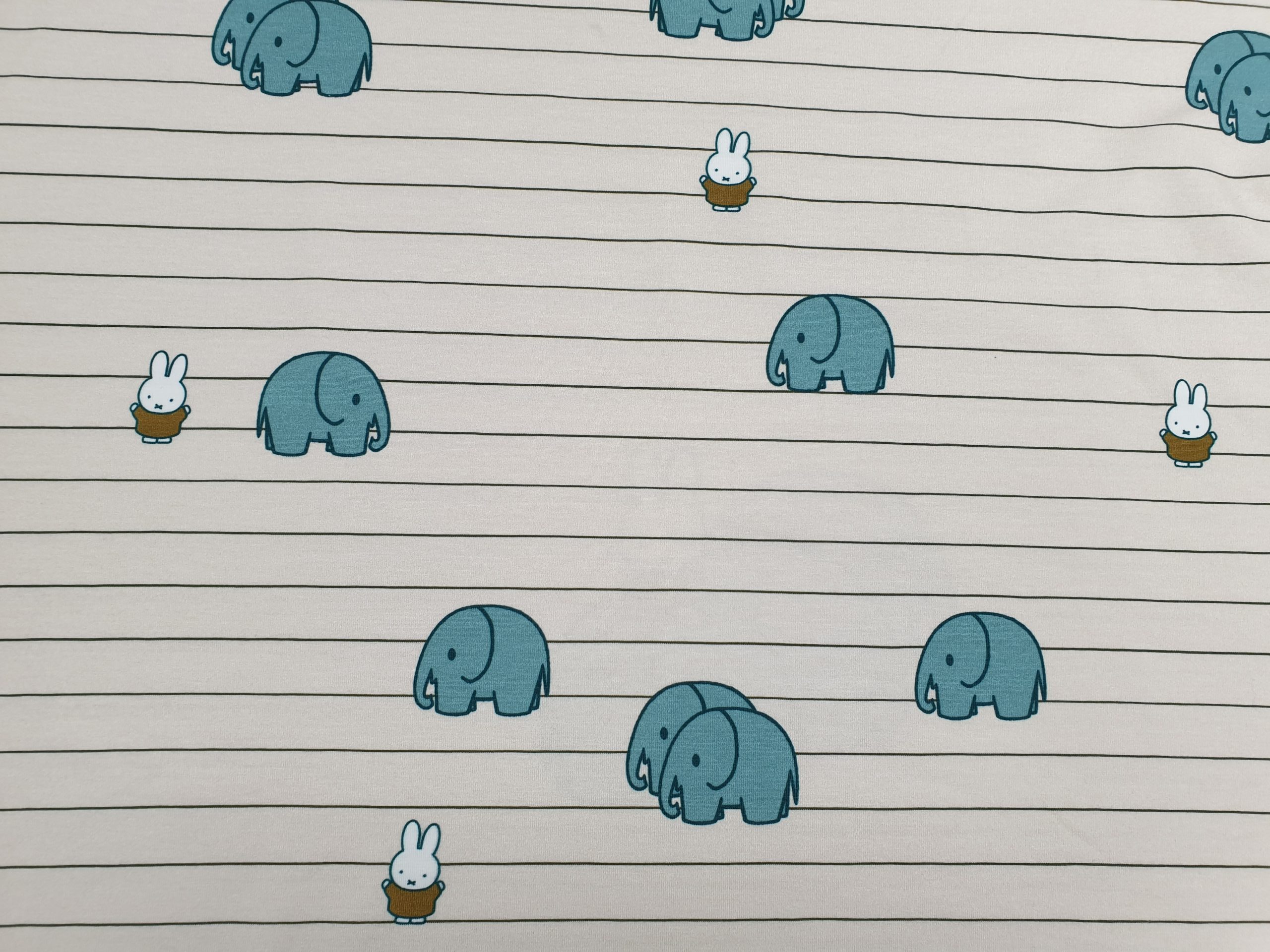De stof heeft twee zijden. Aan de voorzijde één groot patroon met Nijntje en olifanten, perfect voor het maken van een kussen, wandhanger of kinderdekentje.