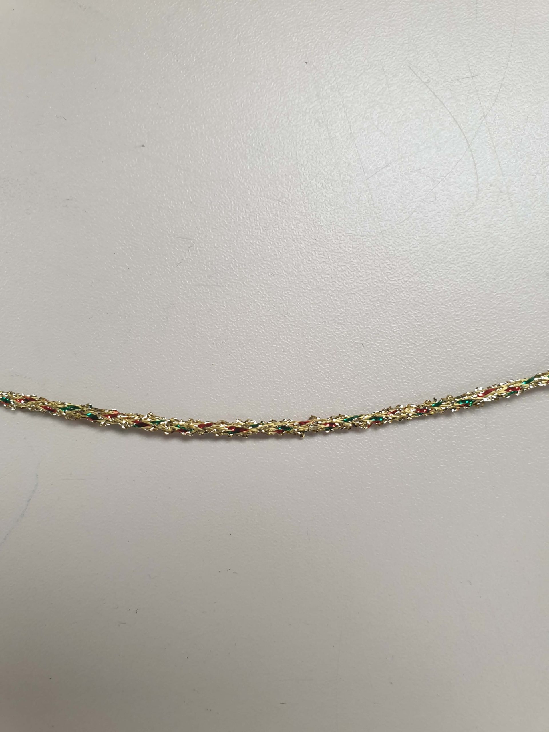 Dit gemêleerd koord met metaaldraad is ideaal om kerstdecoraties te verbinden en te verstevigen. Het koord heeft een metallic gouden, groene en rode melering.