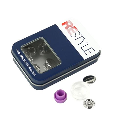 De 6 stofknopen van 15 mm en gereedschap zitten in een mooie tinnenbox, zodat ze handig bij elkaar verpakt blijven en in een opbergbox gedaan kan worden.
