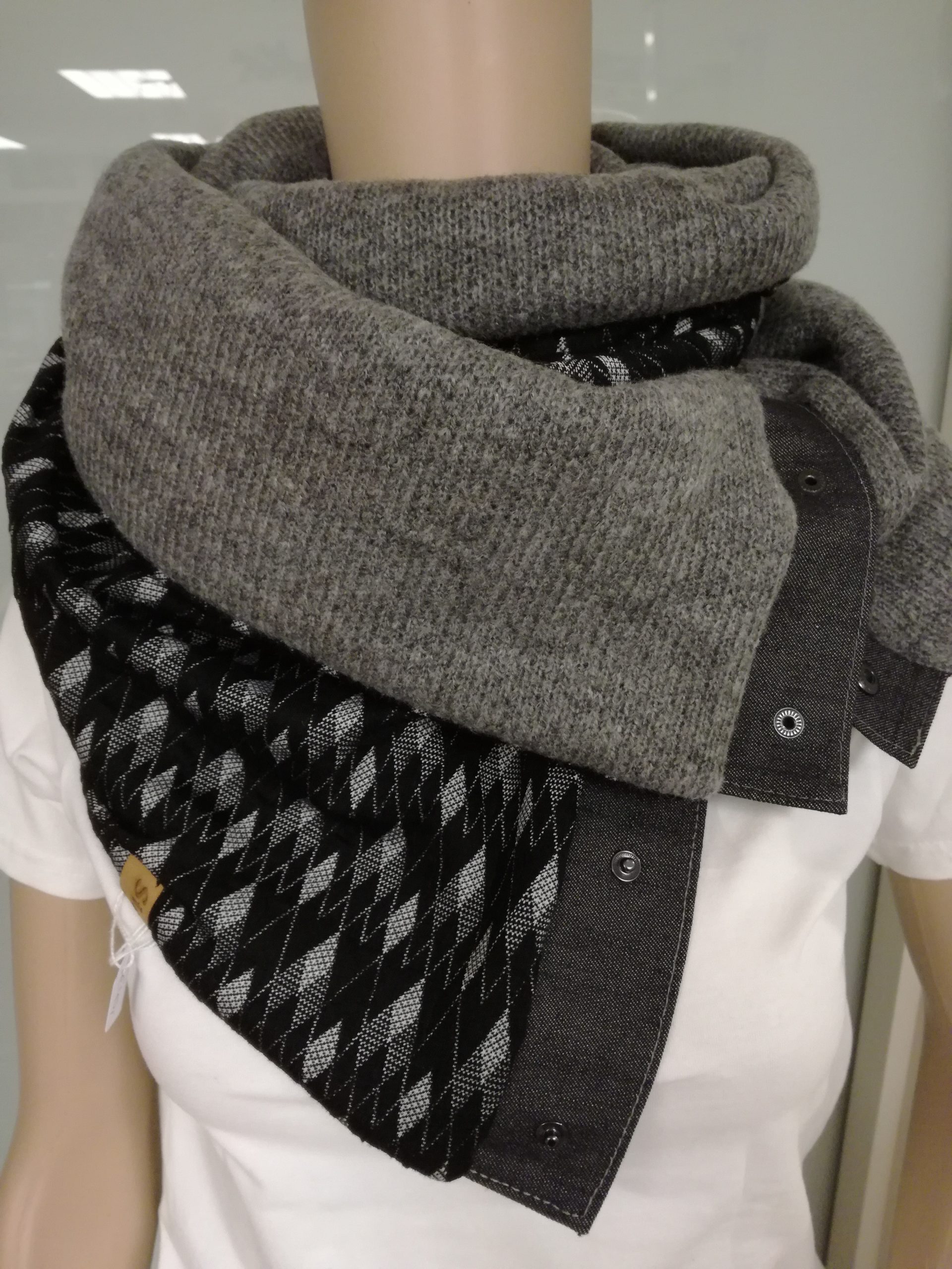 Leuke sjaal van heerlijk gebreide tricot met drukknopen sluiting.
