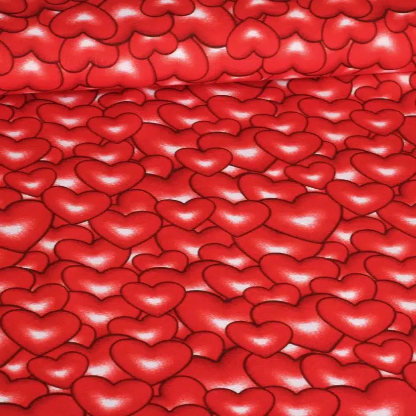 Vrolijke terlenka stof met een opvallende hartjes print. Soepelvallend, sterk en kreukarm. Ideaal voor kleding, accessoires en decoratieve naaiprojecten.