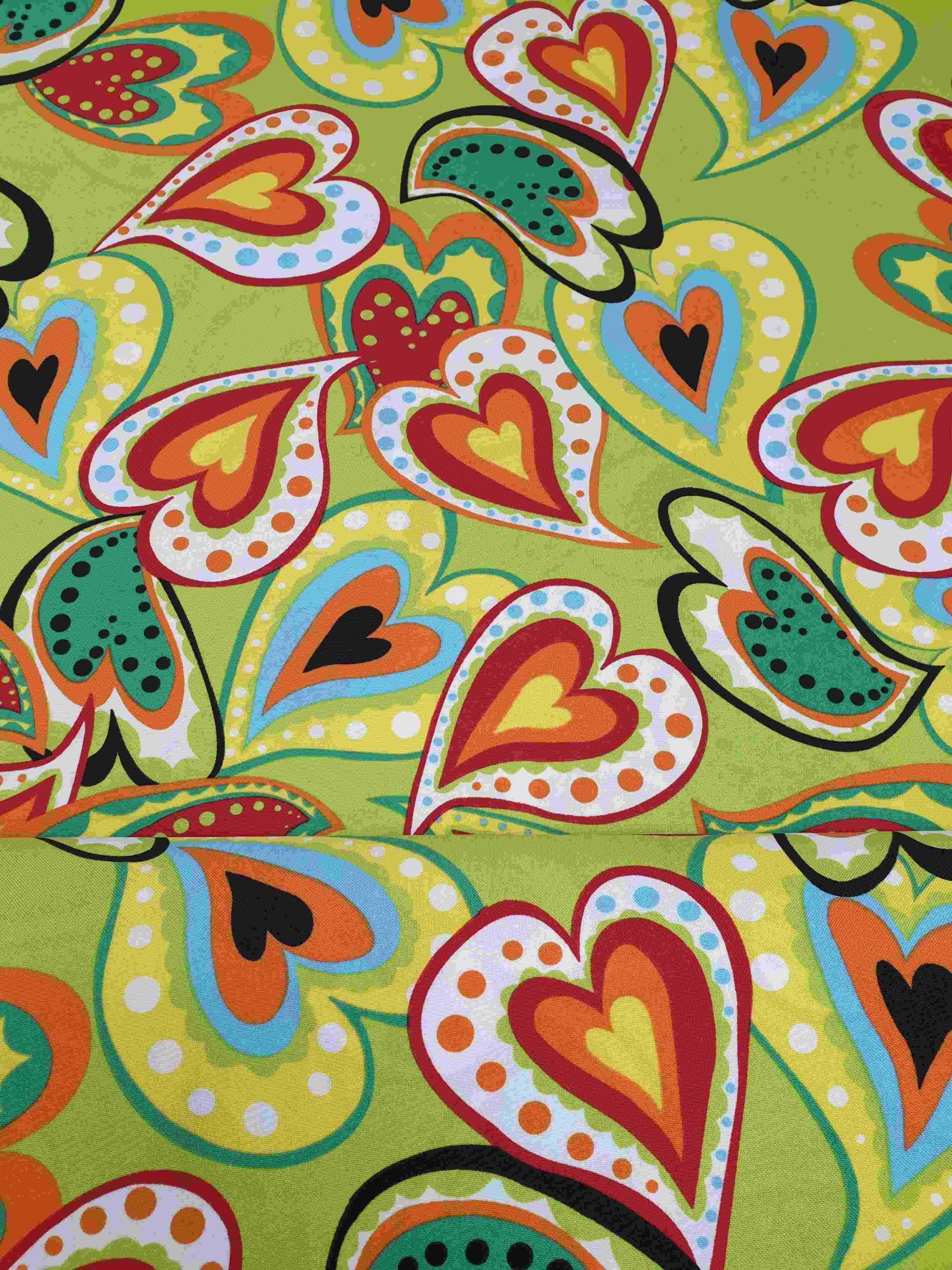 Terlenka roze stof met vrolijk gekleurde harten. Soepel vallend, sterk en kreukarm. Ideaal voor kleding, accessoires en decoratieve naaiprojecten.