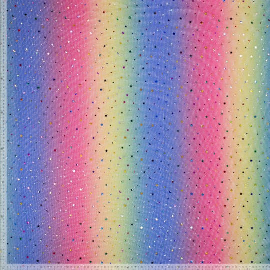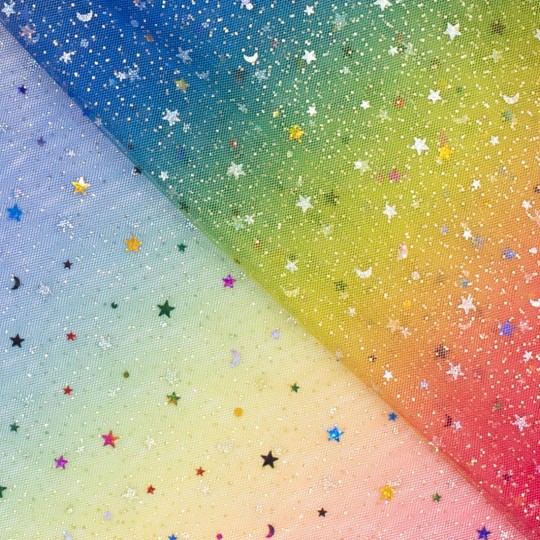 De gebreide stof is een lichte en transparante tule versierd met glinsterende sterren in regenboogkleuren. Met een gewicht van slechts 35 gr/m2 en een breedte van 150 cm, is deze stof perfect voor het maken van feestelijke en opvallende kledingstukken zoals jurken, rokken of accessoires. De glitterafwerking voegt een speelse en sprankelende uitstraling toe, ideaal voor bijzondere gelegenheden of creatieve projecten.