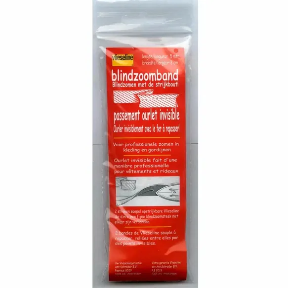 Vlieseline Blindzoomband (ook wel: ‘Perfect Hem’) bestaat uit twee stroken dun en soepel opstrijkbaar band, die langs één zijde met een blindzoomsteek aan elkaar zijn genaaid – de plakzijde wijst bij beide stroken naar buiten. Ideaal voor het eenvoudig en snel aanbrengen van mooie, soepelvallende zomen in bijvoorbeeld blouses, overhemden, japonnen, rokken, jacks, jassen en mantels – naaien is niet meer nodig! Geschikt voor alle stoffen. Het band is gemaakt van 100% polyester en is wasbaar tot 30°C. Vlieseline Blindzoomband is 30mm breed en is verkrijgbaar in wit en zwart.