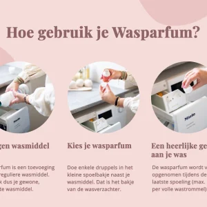 Wasparfum is een toevoeging aan je reguliere wasmiddel. Gebruik dus je gewone, favoriete wasmiddel en doe enkele druppels in het kleine spoelbakje ernaast waardoor de parfum volledig wordt opgenomen tijdens de laatste spoeling. (max. 5 ml. per volle wastrommel)